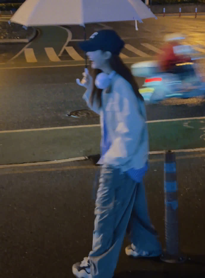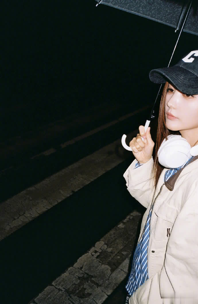 她眼神明亮且略带笑意,嘴角微微上扬,既展现出她甜美的气质,又不失大方与洒脱。李一桐一手稳稳地握住白色雨伞的把手,另一只手插在裤兜,不仅显得随性自然,还为整体造型增添了几分帅气与不羁。