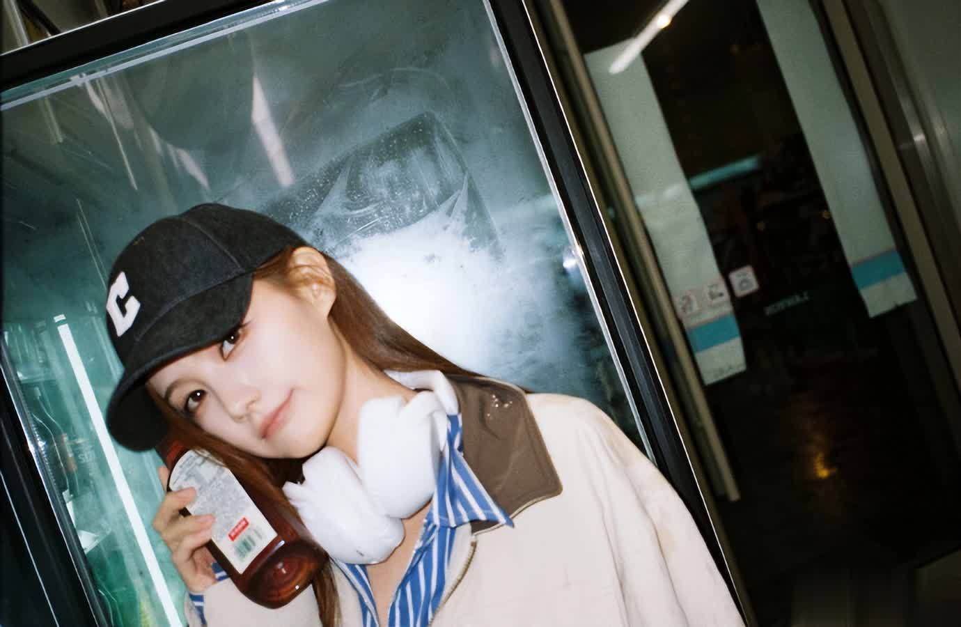 画面中的李一桐穿着米白色的外套简约大方,头戴带有白色字母 “C” 的深色棒球帽,脖子上挂着的白色耳机,透露着时尚潮流的气息。她那自然垂下的长发,为整体造型增添了柔美之感,一手扶着冰柜,身体微微扭转,侧脸看向镜头,眼神明亮且带着笑意,表情自然亲切,给人一种毫无距离感的亲和力,瞬间拉近了与观者的距离。