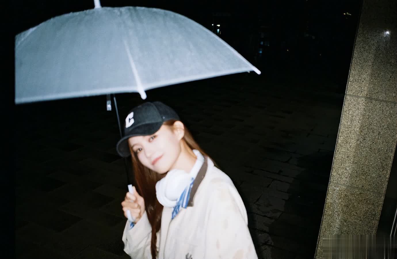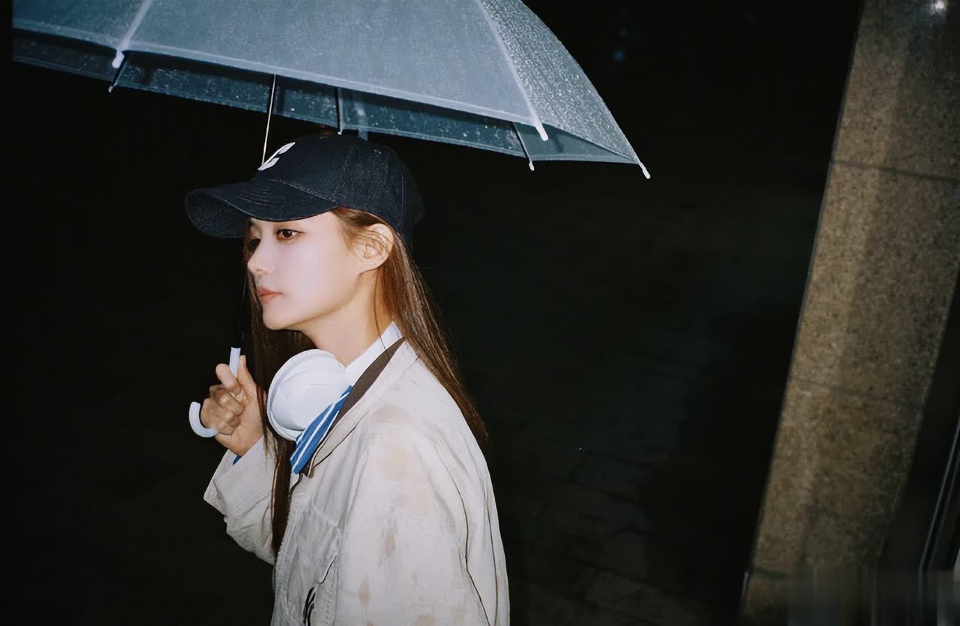 李一桐侧着脸,表情里带着一丝清冷和淡然,与雨夜的静谧氛围相契合,给人一种安静又神秘的感觉。她手持透明雨伞,伞面上有水珠滑落,进一步强化了雨夜的情境,光线柔和地洒在她身上,形成明暗对比,突出了她的轮廓,同时也增添了画面的层次感和艺术感。
